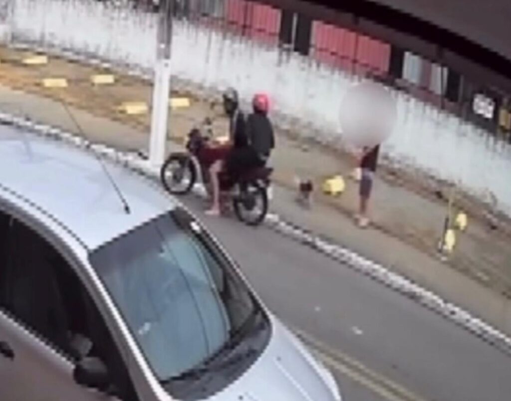 As imagens mostram o momento em que o homem caminha pela calçada enquanto fala ao telefone. Ao avistar o celular, a dupla passa pela vítima, observa e logo retorna. O passageiro da moto saca uma arma de fogo e aponta para o homem, exigindo o aparelho sob ameaça.