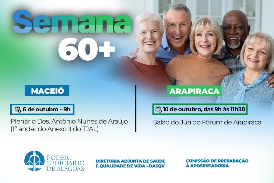 O Poder Judiciário de Alagoas promove no dia 6, em Maceió, e no dia 10, em Arapiraca, ações alusivas à Semana 60+ para magistrados e servidores. Haverá palestras sobre saúde, aposentadoria, divulgação de cursos, entre outras iniciativas.