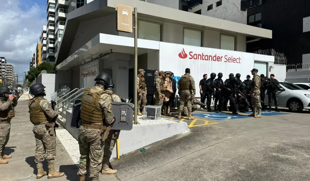 No vídeo é possível ver um grande contingente policial, altamente equipado, em frente a agência do Banco Santander, pronto para iniciar a ação.