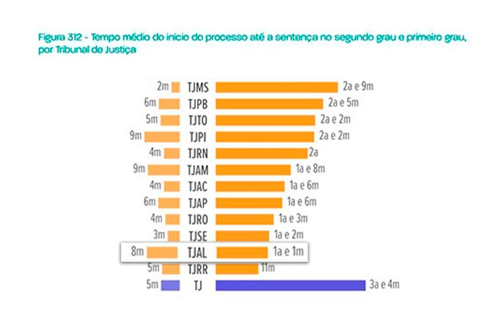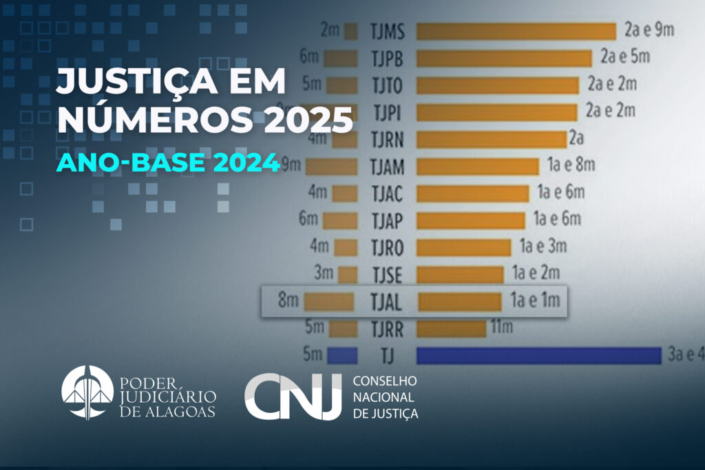 O Tribunal de Justiça de Alagoas (TJAL) é o segundo tribunal do país com menor duração de processo no 1º grau, registrando uma média de 1 ano e 1 mês entre o início do processo e a sentença. Os dados são do último relatório ‘Justiça em Números’, do Conselho Nacional de Justiça (CNJ). No 2º grau, a taxa de duração é de oito meses.