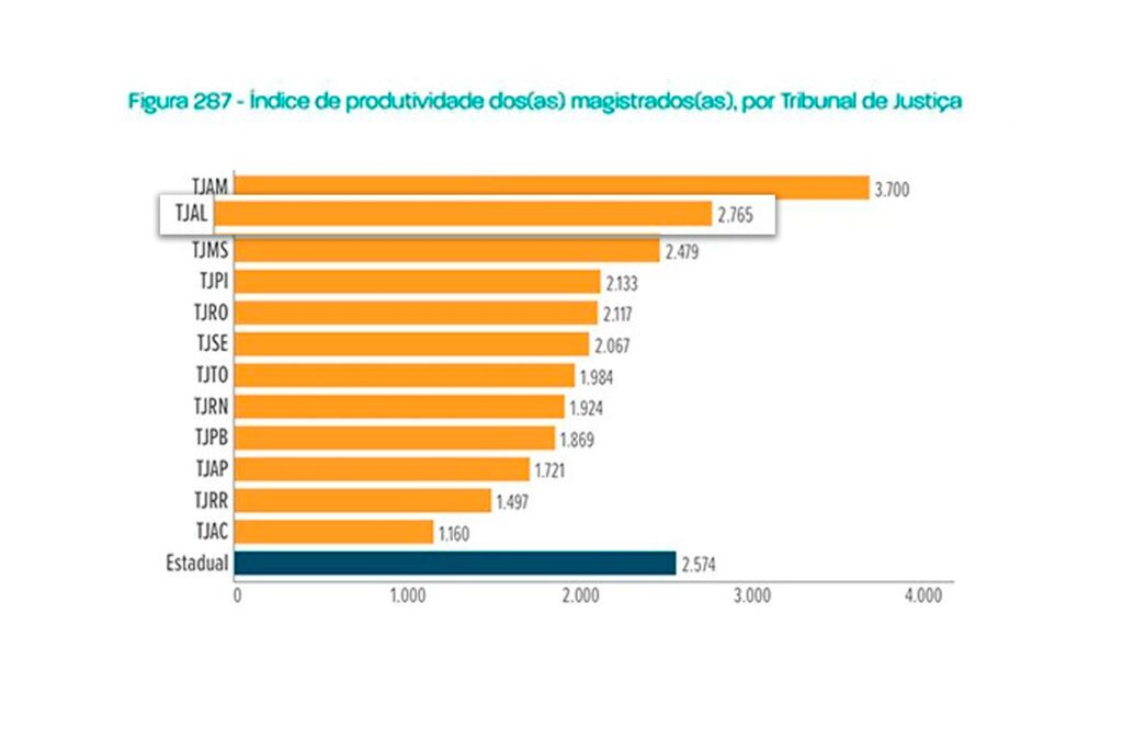 No quesito taxa de produtividade dos juízes, o Judiciário alagoano também se destaca como a segunda maior entre os tribunais de pequeno porte, com uma média de 2.765 processos baixados, ficando atrás apenas do TJ do Amazonas.