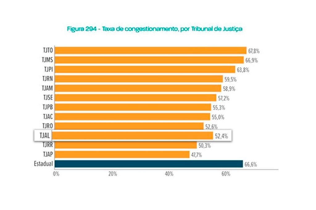 Ainda segundo o relatório do CNJ, o TJAL apresenta a terceira menor taxa de congestionamento dentre as cortes de pequeno porte, registrando um índice de 52,4%, ficando atrás apenas dos TJs de Roraima e Amapá.