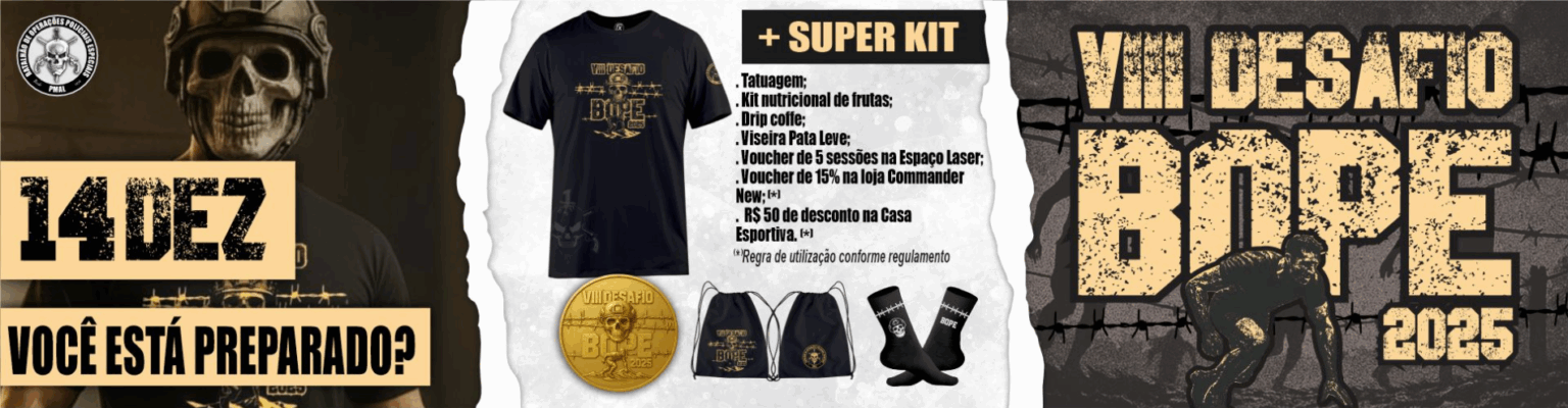 A inscrições para o Desafio Bope 2025 já estão abertas. A prova está marcada para o dia 14 de dezembro de 2025. O evento é promovido pelo Batalhão de Operações Policiais Especiais (Bope) da Polícia Militar de Alagoas (PM-AL).