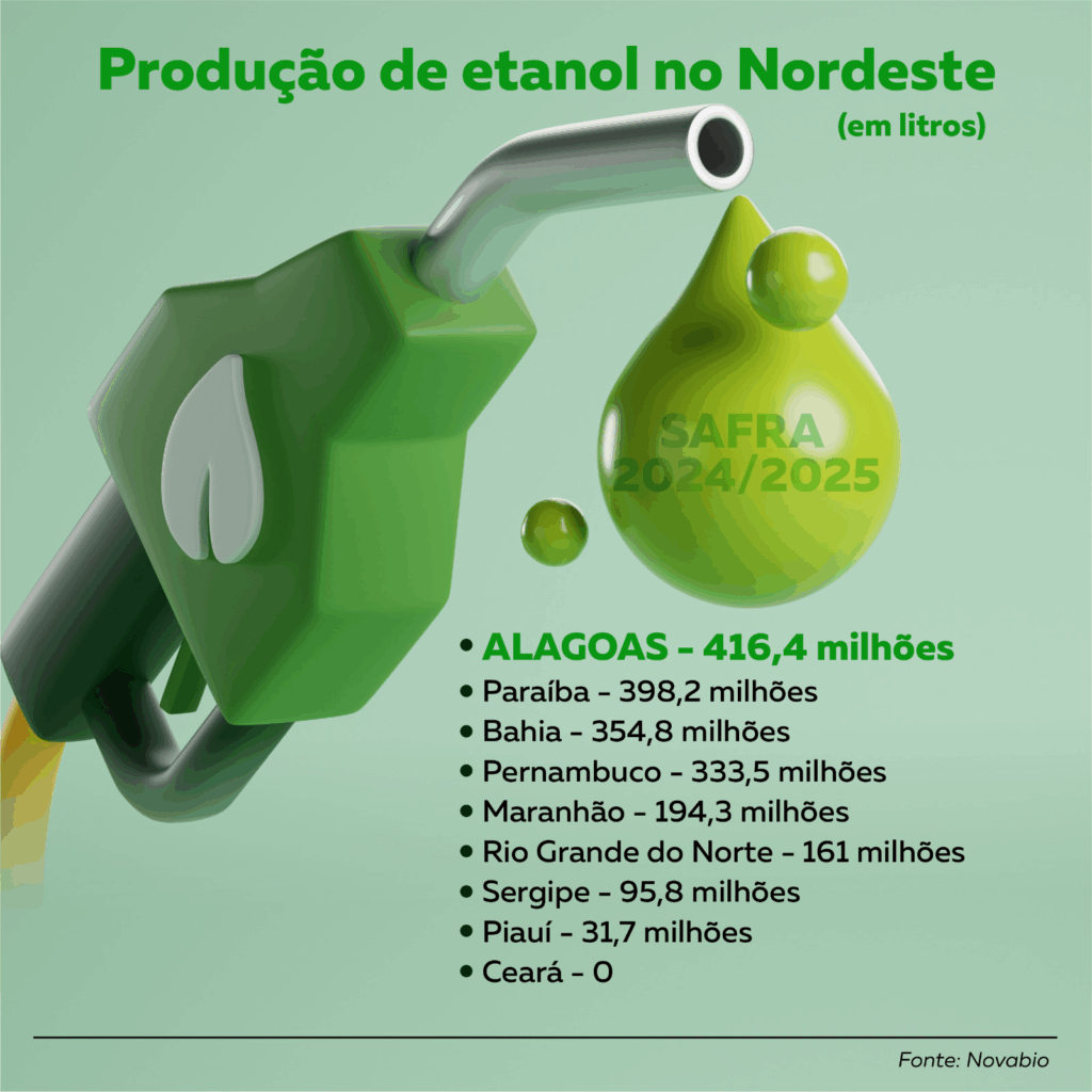A produção de etanol em Alagoas atingiu 416,4 milhões de litros na safra 2024/2025, segundo levantamento divulgado nesta quarta-feira (5), pela Associação de Produtores de Açúcar, Etanol e Bioenergia (NovaBio). Trata-se do maior volume entre os nove estados nordestinos.