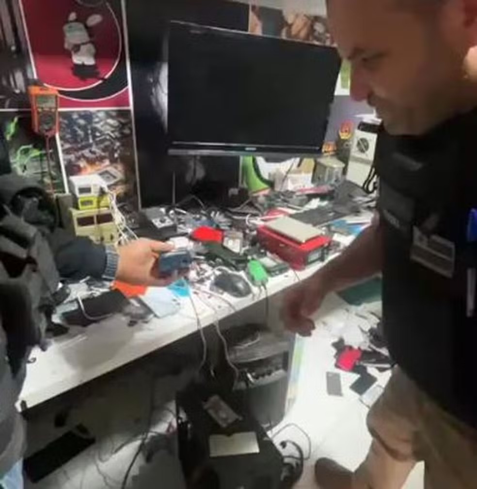 De acordo com a polícia, vários endereços alvo das buscas funcionam como lojas, boxes e quiosques de revenda de celulares.