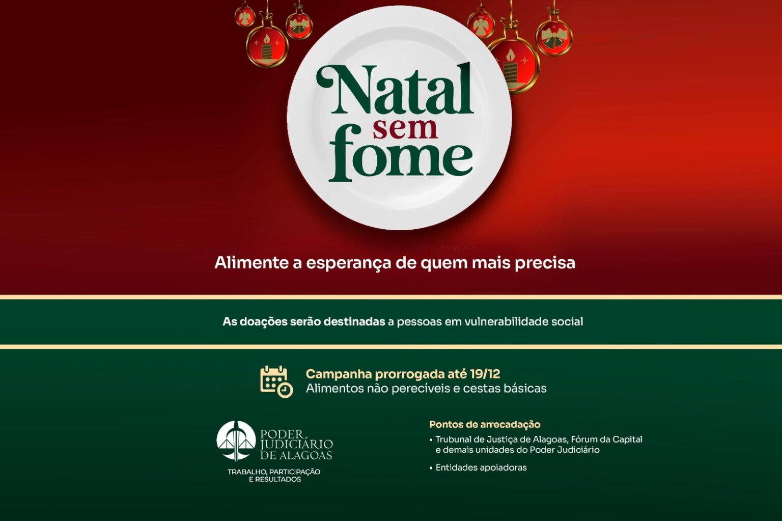 A campanha Natal sem Fome, do Poder Judiciário de Alagoas, foi prorrogada até o dia 19 de dezembro. As doações podem ser entregues na sede do Tribunal de Justiça (TJAL), Fórum da Capital, unidades judiciárias e Maceió Shopping.