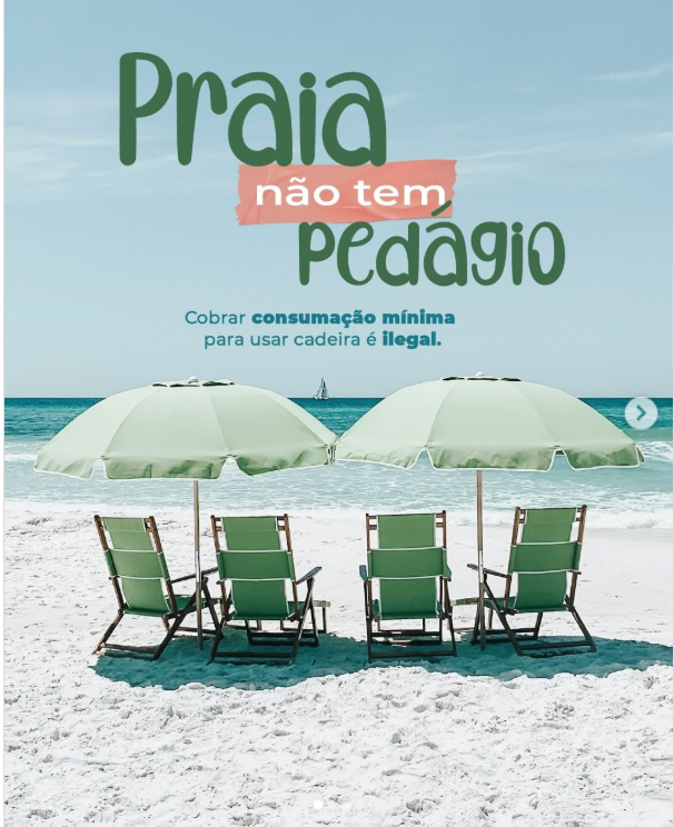 “Cobrar consumo mínimo para usar cadeira ou guarda-sol é ilegal. A praia não tem pedágio”, reforça a campanha.